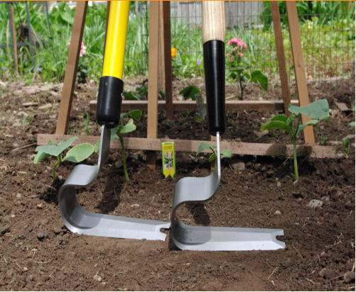 Heron: Our main tool. Rigid and durable 6 in. blade for any condition, especially rock and clay. Available with a 54” shorter handle. (60” is standard.) Fiberglass handle tool weighs 2.46 pounds.    Wood handle tool weighs aprox. 2.88 pounds. See a field tested review @ http://www.joshvolk.com/Reviews/heronhoe.html   TheBayouGardener- Forum review of the Hooke 'n Crooke.
